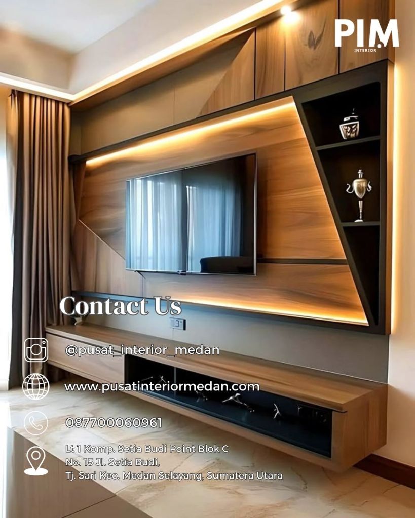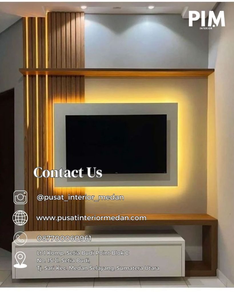 Dapatkan jasa pembuatan backdrop TV terbaik untuk mempercantik ruang keluarga Anda hanya di Pusat Interior Medan!